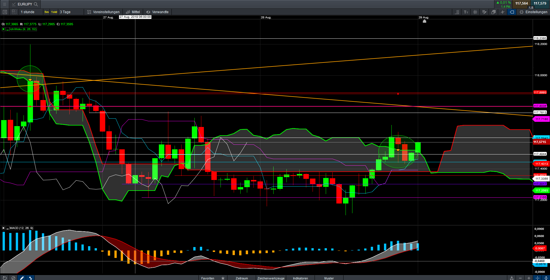 Auch hier gilt frech. Die Stops sind bei 117,80 bzw. 117,88 gesetzt. Take-Profit bei 100,00 – Laufen lassen!