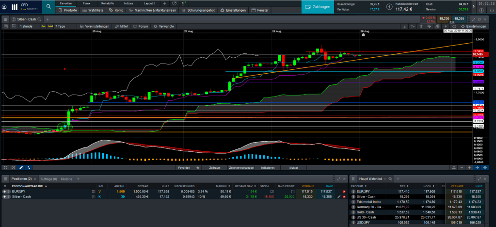 Den Stop-Loss „des Silber-Trades“ habe ich auf 18,10 nachgezogen (G/V: +25.74€), obwohl ich einen längeren Trade wünsche.