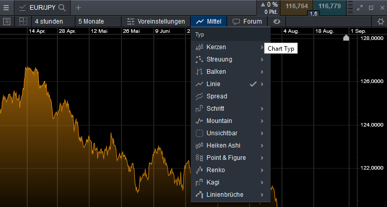 Es gibt verschiedene „Mittel„, quasi Styles, um den Kursverlauf darzustellen; die bekanntesten sind die „Linie“ oder die „Kerzen“ (Candlesticks).