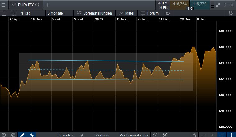 Neben Aufwärtstrend und Abwärtstrend gibt es auch den neutralen „Seitwärts“-Trend bzw. -Kanal. Beim Seitwärtskanal sind die gebildeten Hochs und Tiefs stets auf gleicher Höhe und der Kurs bewegt sich innerhalb dieser Marken hin und her, schafft es also weder gegen oben noch nach unten auszubrechen. Die Beispielgrafik zum Seitwärts-Trend bzw. -Kanal:
