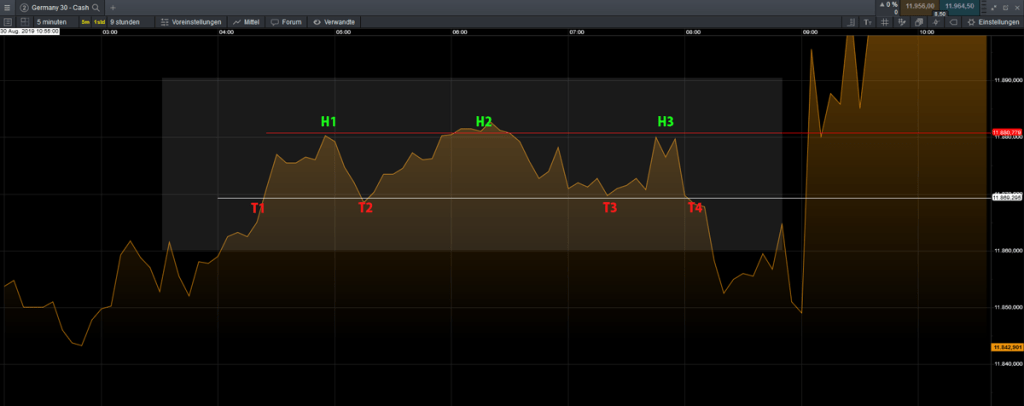 Gerade für die Wahl eines guten Einstiegspunkts rate ich, rational und nicht emotional vorzugehen. Rational bedeutet das, was ich oben beschrieben habe: man sucht sich zuerst ein passendes Produkt aus (Index, Währungen, Rohstoffe, Aktien etc) und schaut sich dann erst den Kurschart des aktuellen Tages an („Intraday„), z.B. im „5-Minuten“-Intervall. Dann zeichne ich die horizontalen/diagonalen Linien. Dann schaue ich, ob der Kurs gerade in einem Dreieck oder in einem Trendkanal ist.