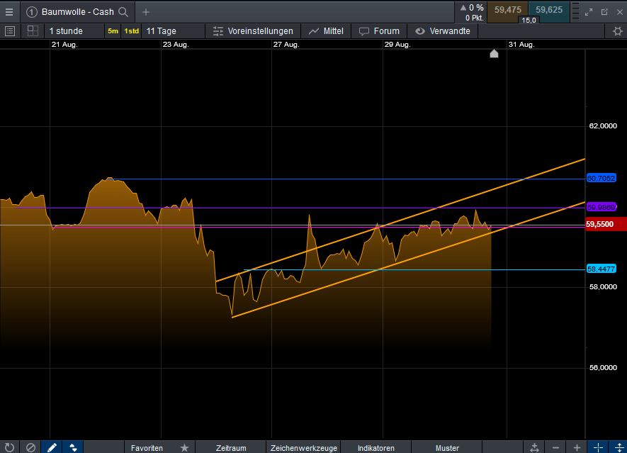 Dann zoome ich in einen grösseren Zeitraum (Woche, Monat oder Jahr) heraus und wechsle dazu z.B. in den „1-Stunden“-Intervall. Jetzt sehe ich die (zeitlich) übergeordnete Konstellation. Denn innerhalb eines Intraday-Charts sieht der „Trend“ vielleicht steigend aus, gleichzeitig lastet aber ein starker übergeordneter Abwärtstrend auf dem Kurs.