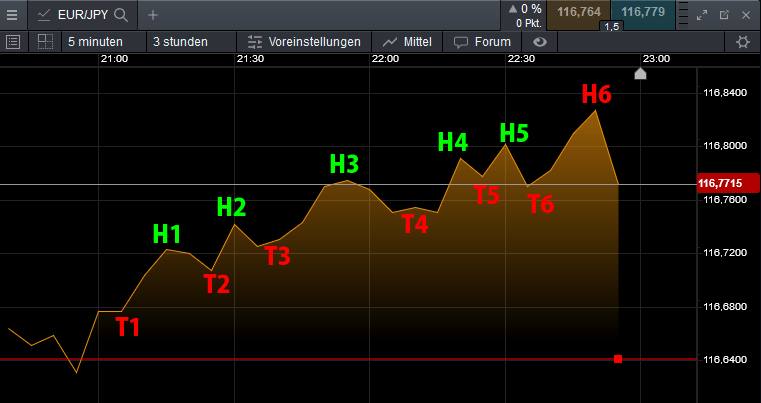 Ein Kurs, egal welcher Art, steigt oder fällt. Manchmal dauert ein Steigen oder Fallen aber länger und hält an. „Normal“ ist: wenn ein Kurs („T1“, Tief 1), der gestiegen ist, sein „Hoch“ („H1“, Hoch 1) gefunden hat, erholt er sich naturgemäss wieder ein Stück, fällt aber nicht mehr so tief, wie er gestartet ist – sein neues „Tief“ („T2“) ist dann höher als das letzte „Tief“ („T1“) . Dann zieht der Kurs wieder weiter hoch und erreicht ein neues „Hoch“ („H2“), höher als das letzte „Hoch“. Solange so ein Muster anhält, spricht man von einem Trend. Die Beispielgrafik eines Aufwärtstrends: